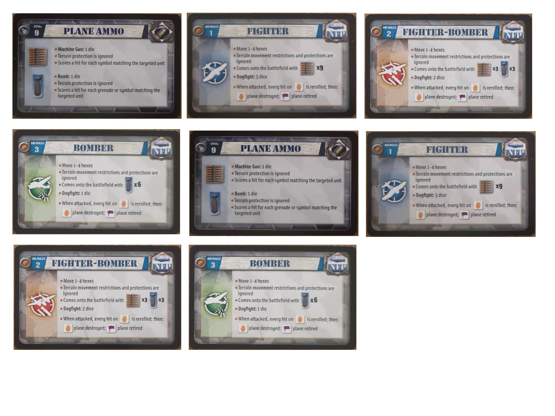 These cards have some mistakes: use ‘‘for all attacks during this run’’ instead of ‘‘for all attacks during this turn’’, at Ground To Air Ambush the correct text is ''Your ground unit battles immediately with 1 additional die. Hits are also scored when rolling a star on the combat roll (the confirmation roll works as usual). If enemy aircraft is not eliminated or forced to retire, it may complete the attack run. Play this card in the move phase when an enemy aircraft places an ammo marker against a ground unit.